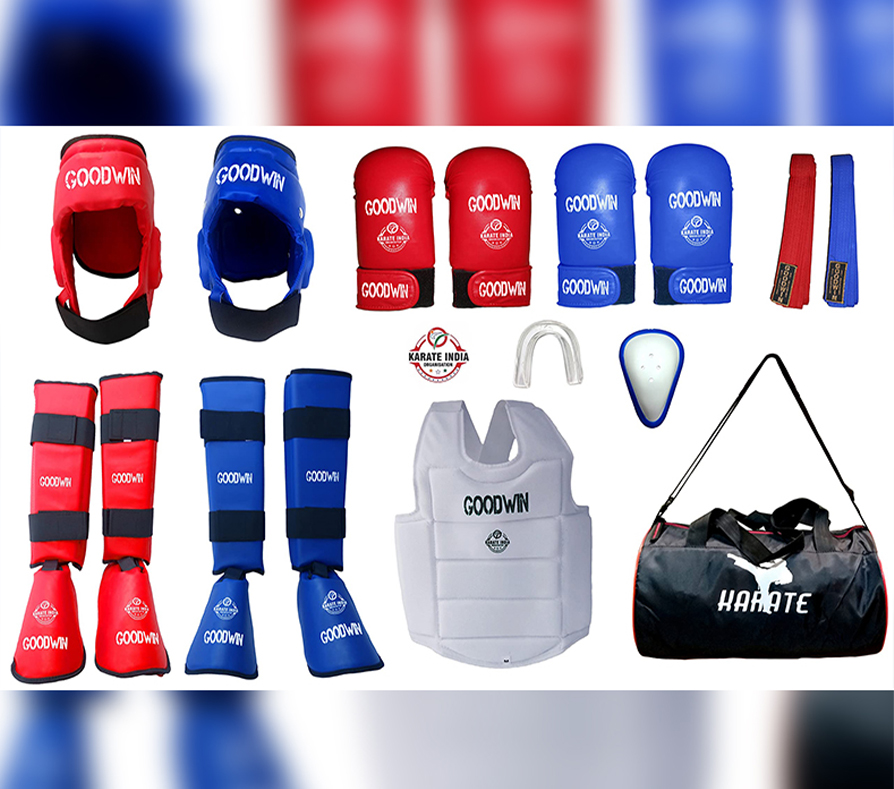 Karate kits with uniform, belt, gloves, and guards—designed for flexibility, protection, and comfort during training and grading sessions.